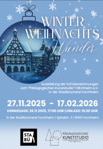 In der Stadtbücherei Forchheim werden vom 27.11.2025 bis 17.02.206 ausgewählte Werke der Schüler*innen des Pädagogischen Kunststudio Forchheim e. V. präsentiert. Die besten Zeichnungen und Kunstobjekte rund um das Thema Weihnachten laden in der Ausstellung mit dem Titel „WinterWeihnachtsWunder“ dazu ein, den Zauber und das Wunder dieser besonderen Zeit immer wieder neu zu erleben. Verschiedene Techniken, kreative Ansätze sowie eine liebevoll gestaltete Fotoszene machen die Ausstellung zu einem inspirierenden Erlebnis für Groß und Klein.