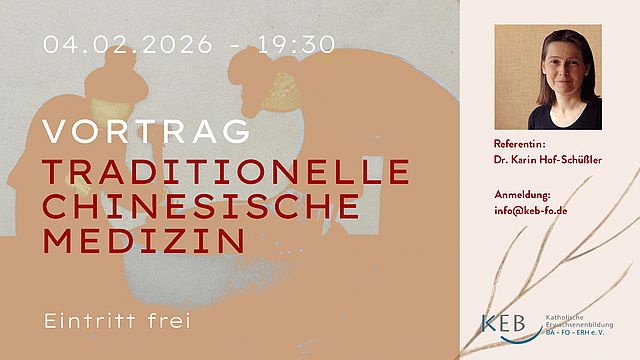 Der über Jahrtausende angesammelte Erfahrungsschatz der chinesischen Medizin hat zum Thema, wie wir unser Gleichgewicht und damit unsere Selbstregulationskräfte erhalten oder wieder herstellen können. Er kann zur Gesunderhaltung ebenso eingesetzt werden wie zur Therapie insbesondere chronischer Krankheiten. Damit stellt die TCM (traditionell chinesische Medizin) eine wertvolle mögliche Ergänzung zu unserer westlichen Medizin dar. In Vortrag und Gespräch wird eine Einführung in die Grundbegriffe und wesentlichen Behandlungsmethoden der TCM gegeben.